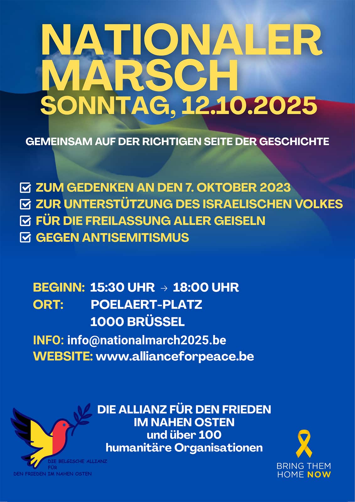 Nehmen Sie am nationalen Marsch in Brüssel teil – Sonntag, 12. Oktober 2025, 15:30–18:00 Uhr (Poelaert-Platz) –, um des 07.10.23 zu gedenken, das israelische Volk zu unterstützen, die Freilassung aller Geiseln zu fordern und sich gegen Antisemitismus zu stellen.