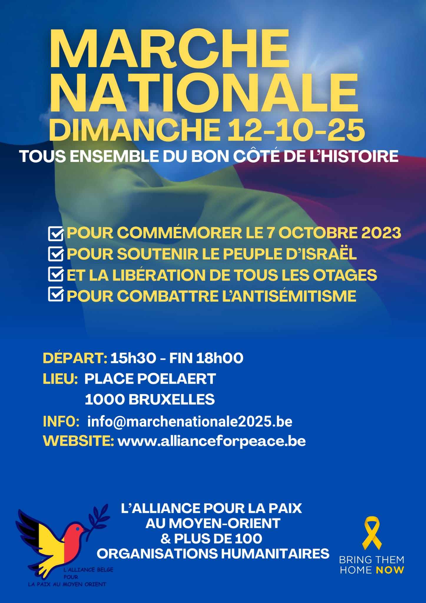 Participez à la Marche nationale à Bruxelles — dimanche 12 octobre 2025, de 15h30 à 18h00 (Place Poelaert) — pour commémorer le 07.10.23, soutenir le peuple d'Israël, exiger la libération de tous les otages et lutter contre l'antisémitisme.
